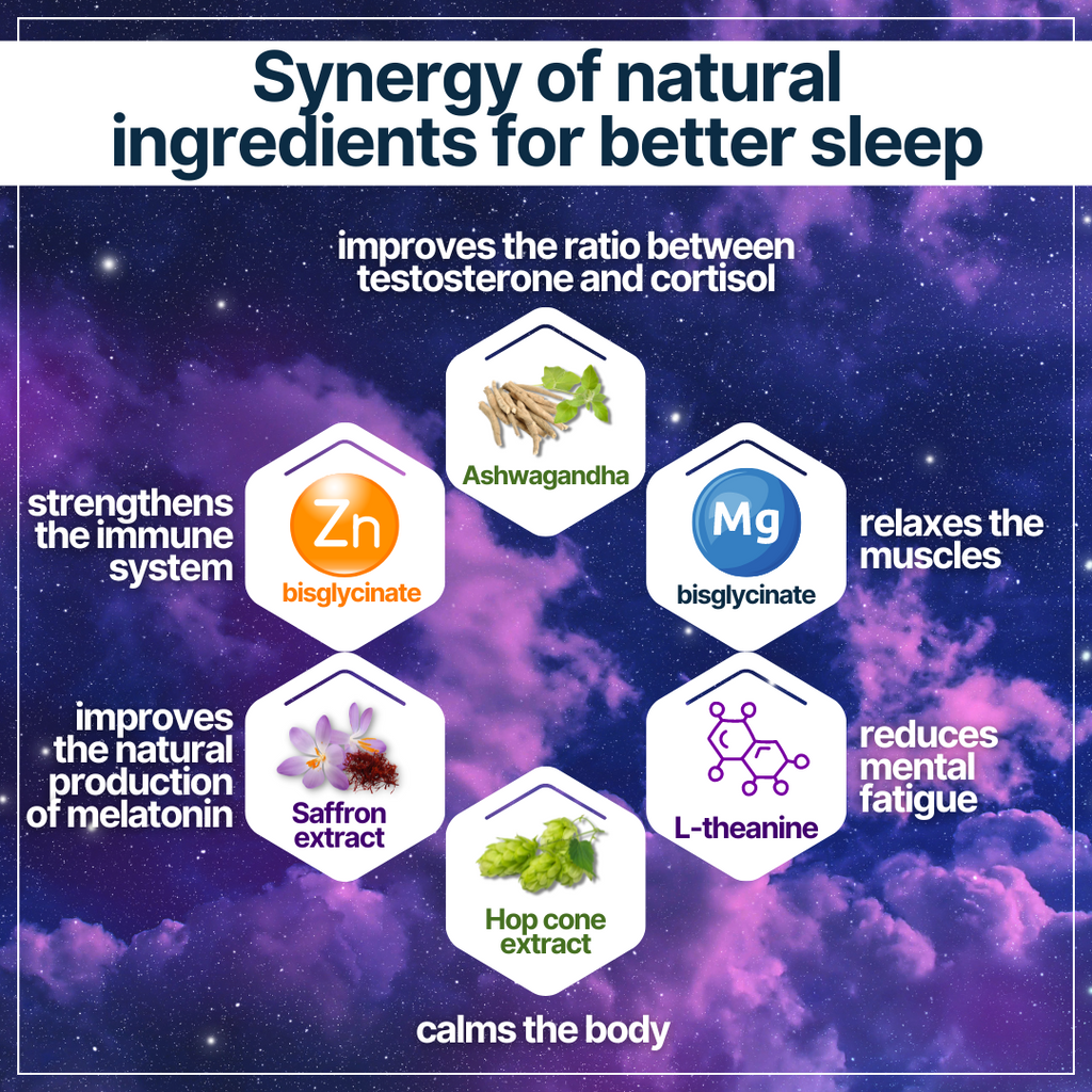 Voedingssupplement. Ingrediënten: ashwagandha-wortelextract (Withania somnifera), gestandaardiseerd op 7 % withanoliden, magnesium bisglycinaat, L-theanine, hop-extract (Humulus lupulus), maltodextrine, saffraan-extract (Crocus sativus), antiklontermiddelen: magnesiumzouten van vetzuren en siliciumdioxide, zink bisglycinaat, capsule (omhulsel: hydroxypropylmethylcellulose, carrageen, kleurstof: calciumcarbonaat, gemodificeerd zetmeel, zuurteregelaar: kaliumacetaat). Kan noten, gluten, soja en melk bevatten. Netto hoeveelheid: 60 capsules.
